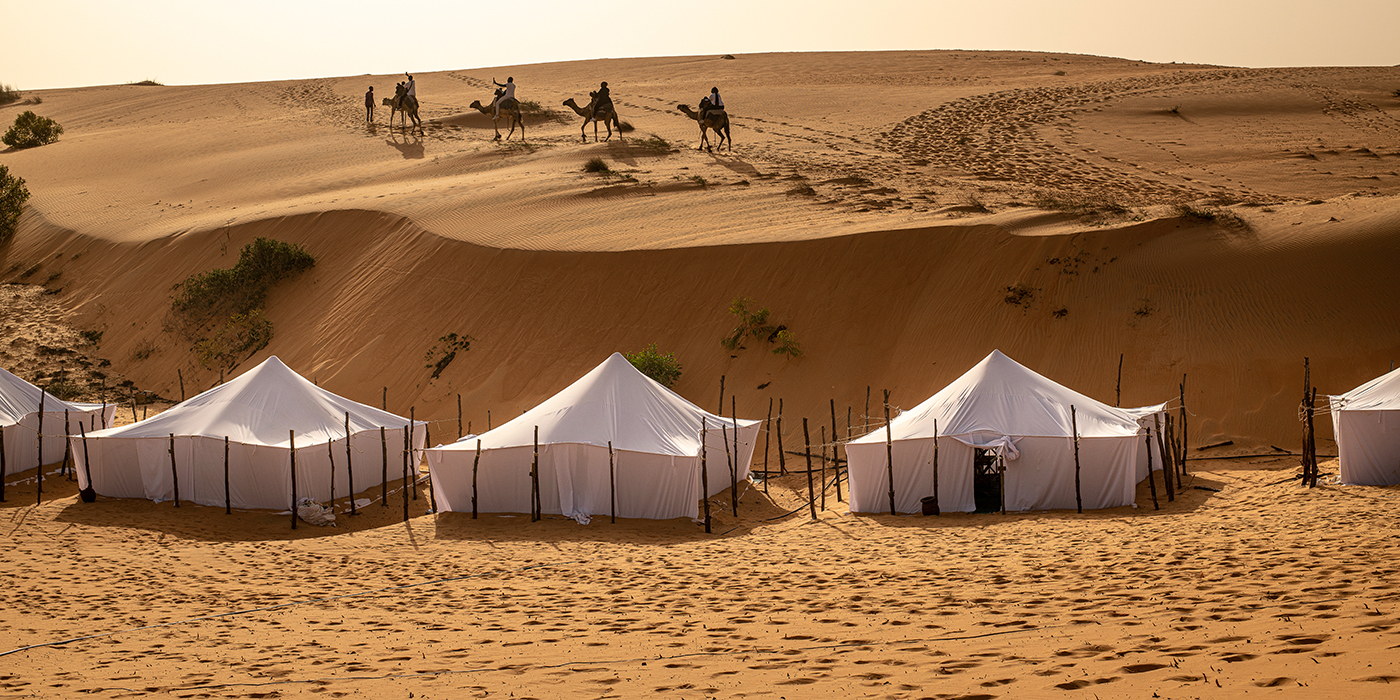 The adventure begins with a journey through Sahelian areas before reaching the first dunes that mark the entrance to the desert. Once there, the bivouac offers a traditional setting that combines simple comfort and authenticity. You discover the world of dunes, sculpted by the wind and transformed by the light: the golden yellow of the morning, the deep orange of sunset, and the deep blue of night.
